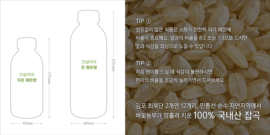 전설약곡, 신선하게 보관하기! 15도 이하로 냉장보관 해주세요 잡곡의 신선도를 유지하기 위해서는 실온보관이 아닌 냉장보관을 추천합니다. 또한 고온, 습기, 직사광선도 피해주세요. 특히 습기는 쌀의 최대 적입니다. 잡곡을 소분하여 밀폐용기에 보관해주세요 잡곡이 공기를 만나게 되면 수분을 빼앗깁니다. 페트병이나 밀폐용기를 사용해 보관해주시고 공기가 들어가지 않도록 한번 더 포장해 주시면 좋습니다. 쌀통을 이용할 땐 깨끗이 닦아주세요 만약 쌀통에 기존에 들어있던 잡곡이나 쌀가루가 남아 있으면 곰팡이나 벌레가 생길 수 있으니 사용전에 꼭 통을 깨끗이 씻어주시기 바랍니다. |
